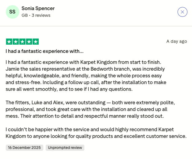 At Karpet Kingdom, we take pride in providing exceptional service and high-quality products to our valued customers. Your satisfaction is our top priority, and we believe in building trust through excellent customer experiences. But don’t just take our word for it – read what our happy customers have to say about their experiences with us!